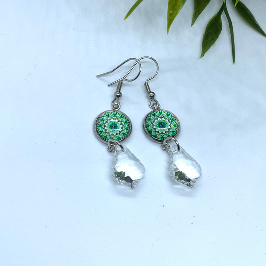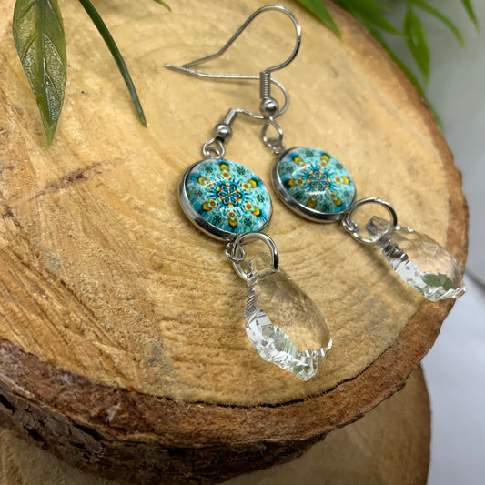 Mandala and Crystal Charm Drop earrings, Mothers Day Glass Cabochon Earrings, Boho Style Accessories for Girlfriend, Ready to Ship