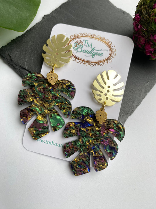 Multicoloured Monstera Leaf Earrings, Leaf Shaped Stud Earrings for Ladies, Rainbow Glitter Acrylic Charm Earrings, Gold Plated Jewelry