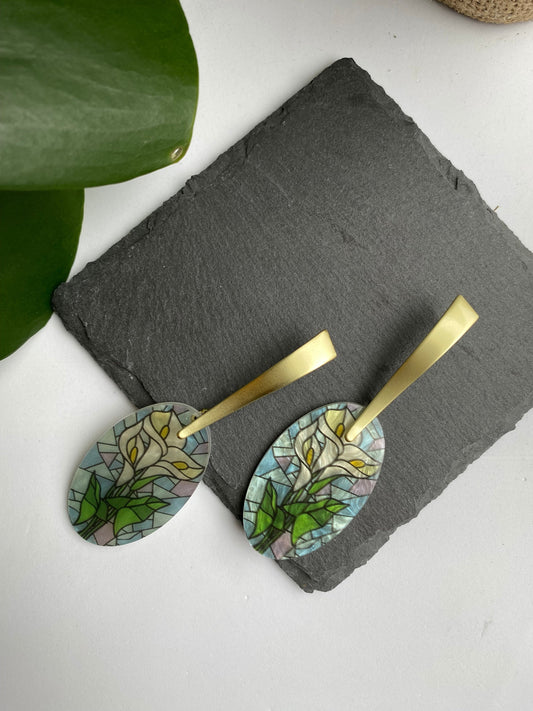 Lily Floral Drop Earrings, Long Gold plated Earring Connectors, Summer Jewellery for Moms, Cala Lily Statement Earrings for Ladies