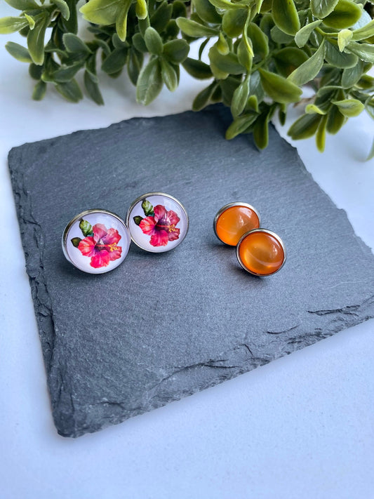 Tropical Style Stud Earrings, Hibiscus Flower Earrings, Orange Cabochon Earrings for Ladies, Mothers Day Gift, Double Stud Pack Earrings Set